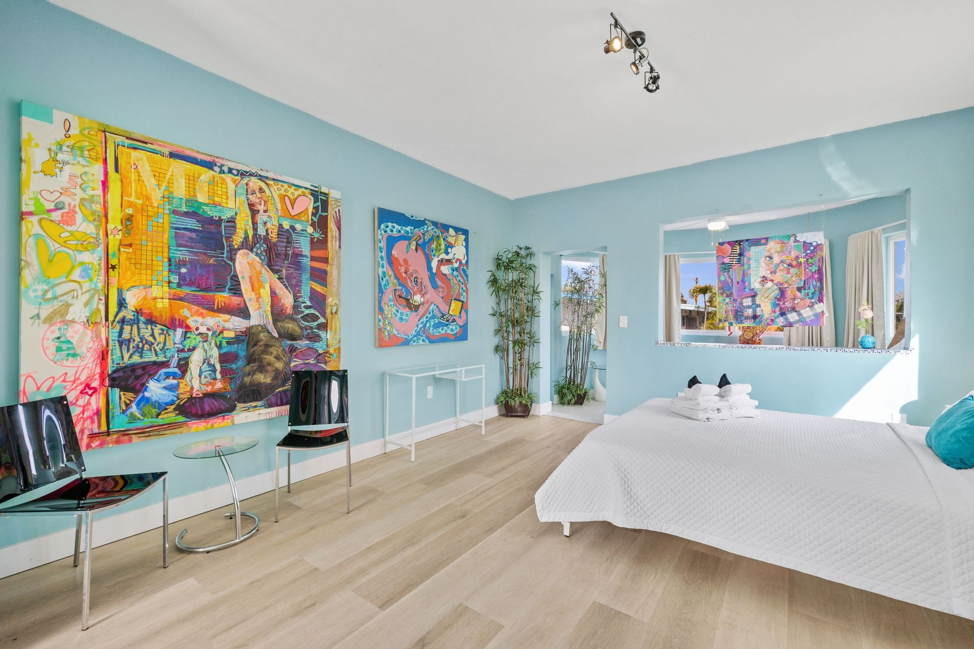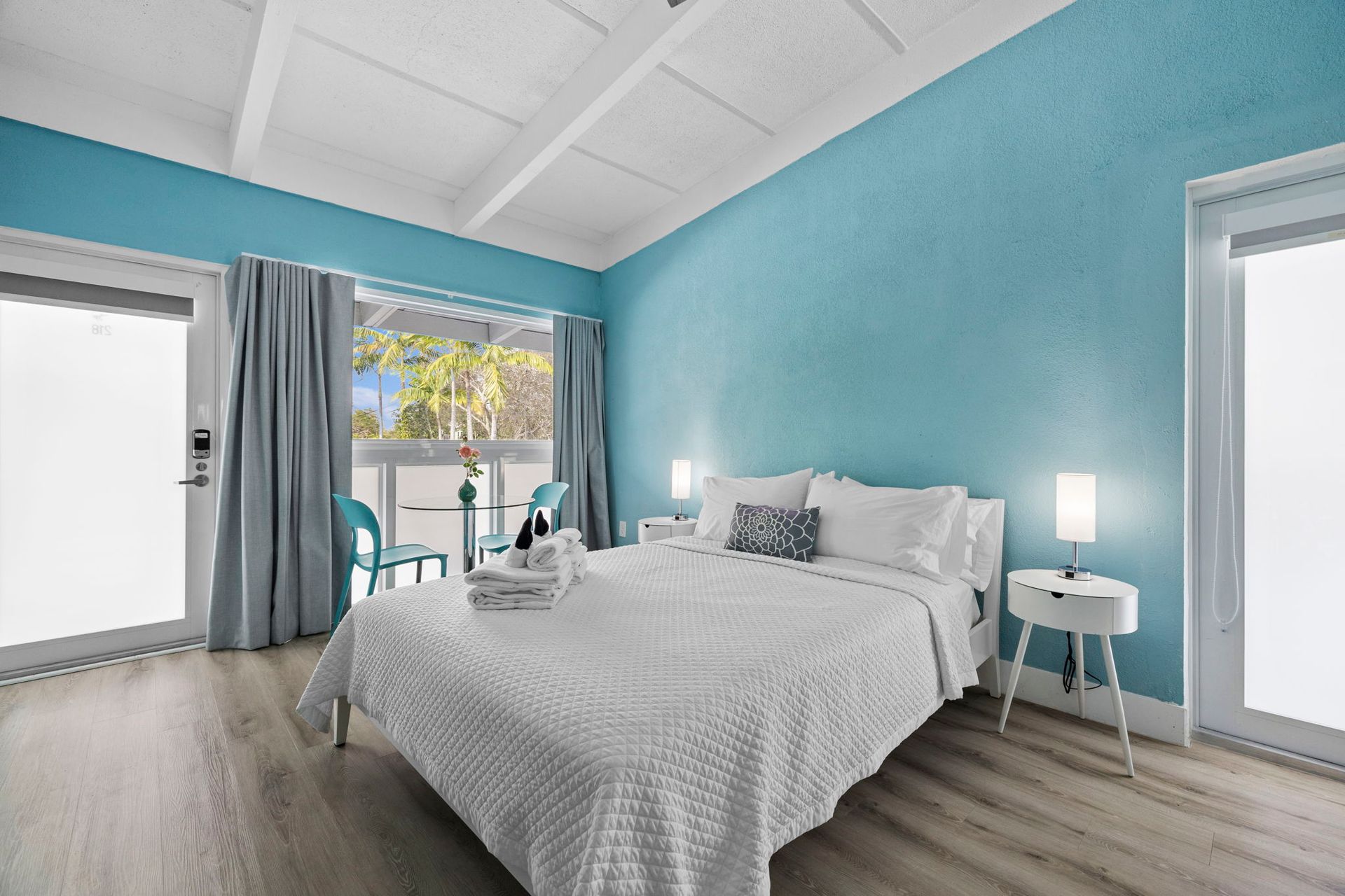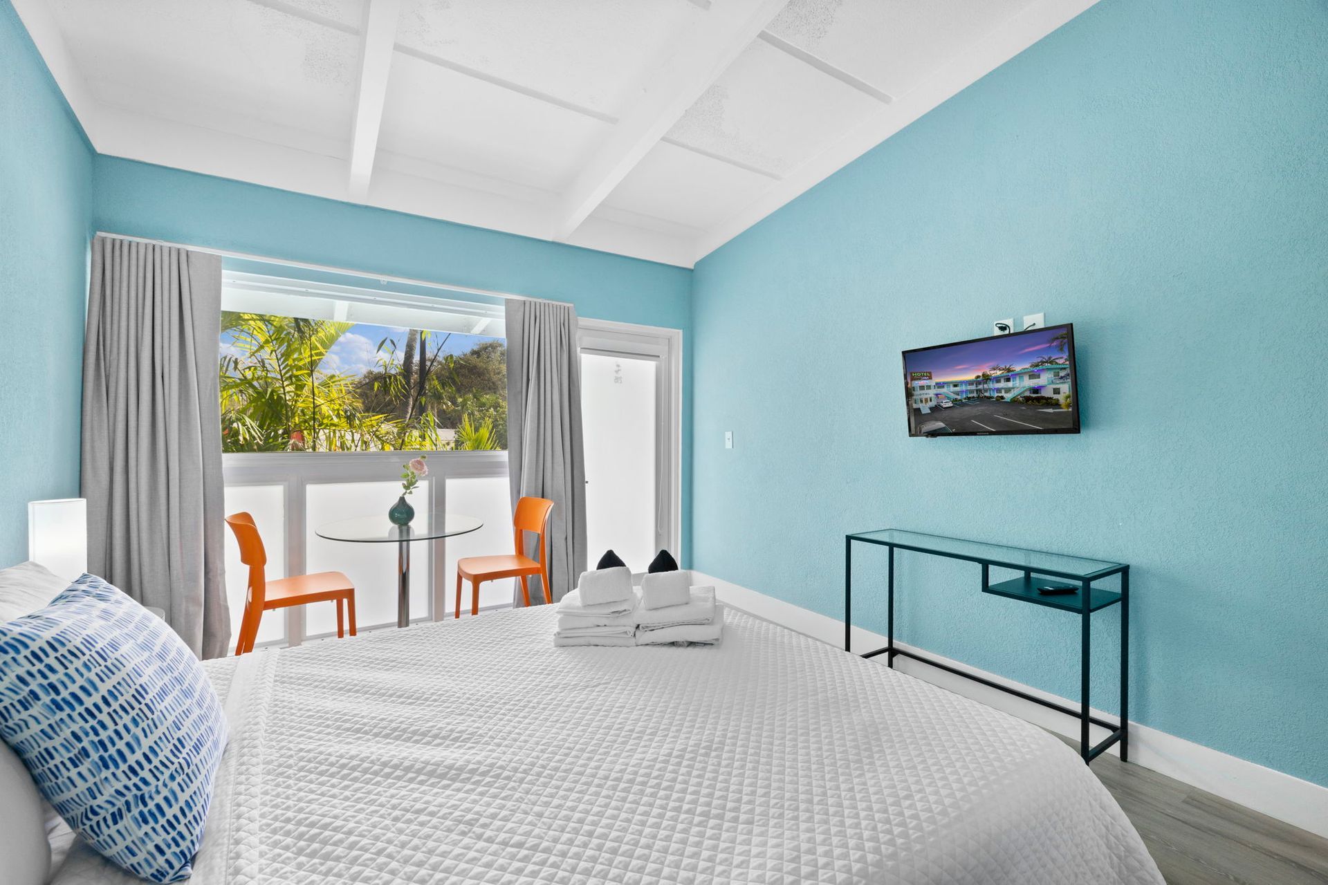 We have a retro vibe throughout the hotel, with funky paintings, cute artwork, and bright colors. Our pool is clean and well-maintained, and we provide lounge chairs for your relaxation. We offer free parking, free Wi-Fi, and a newly renovated lobby/cafe. Our hotel is known as the "secret gem" because of its size and the surrounding nature of palm trees, flowers, and fresh breezes. Our location is perfect for relaxation and letting go.